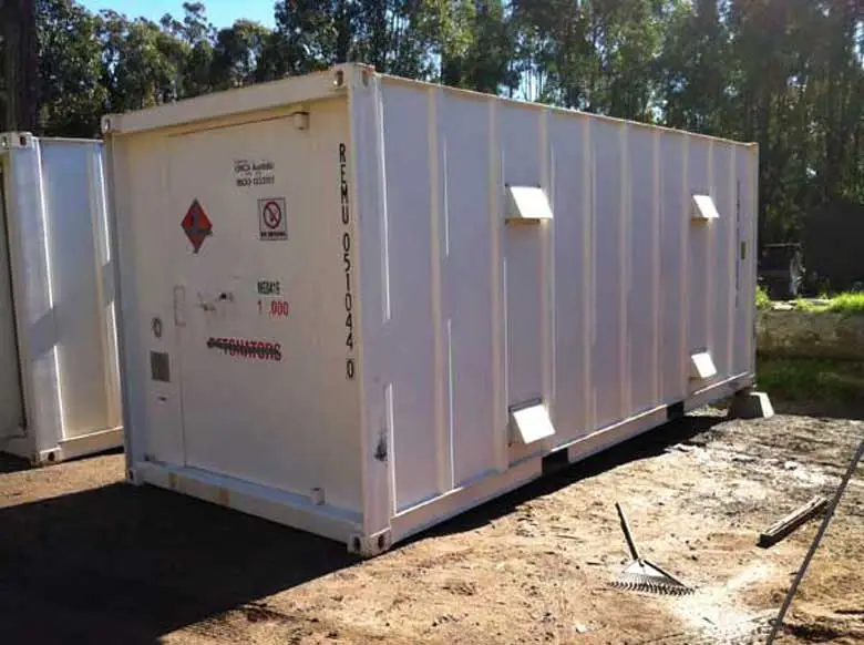 Our explosive magazines are constructed to Australian Standard AS2187.1-1998 and meet the stringent requirements of Australian Explosive Storage Regulations. The high quality relocatable explosive magazines are delivered ready-made for the storage of between 250 Kg and 20,000 Kg of explosives, detonators, MILSPEC, fireworks and other hazardous materials where safety and security is of critical importance.